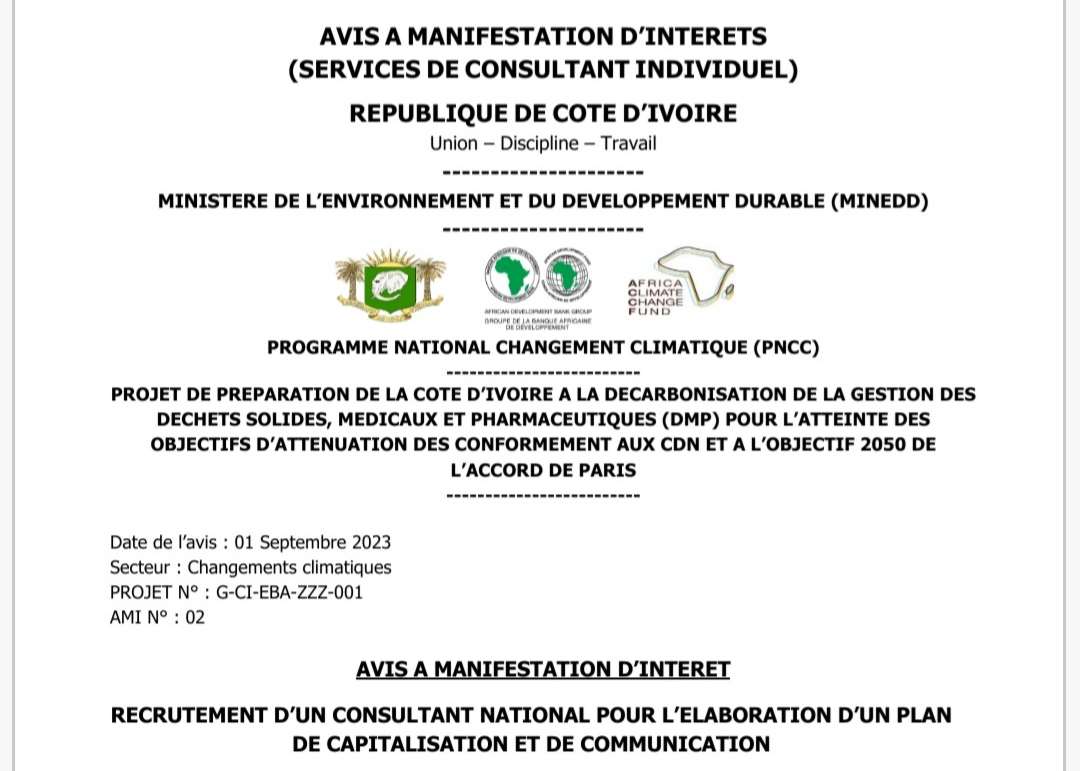 Le Gouvernement de la République de Côte d’Ivoire, représenté par le Ministère de l’Environnement et du Développement Durable (MINEDD), a reçu un don du Fonds pour les Changements Climatiques en Afrique (FCCA) administré par la Banque Africaine de Développement (BAD), d’un montant de 277 300 USD affectés pour la préparation de la Côte d’Ivoire a la décarbonisation de la gestion des Déchets solides, Médicaux et pharmaceutiques (DMP) pour l’atteinte des objectifs d’atténuation des émissions de Gaz à Effets de Serre (GES) conformément aux Contributions Déterminées au niveau National (CDN) et a l’objectif 2050 de accord de Paris. L’unité de Gestion du Projet se propose d’utiliser une partie des fonds de ce don pour effectuer les paiements autorisés au titre du contrat de recrutement au titre du contrat de recrutement d’un consultant national pour l’élaboration d’un plan de capitalisation et de communication.